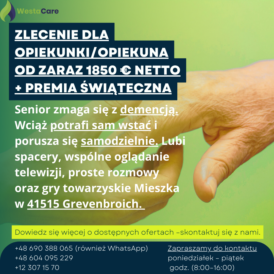 Zlecenie dla Opiekunki/Opiekuna od zaraz 1850 € netto + Premia Świąteczna