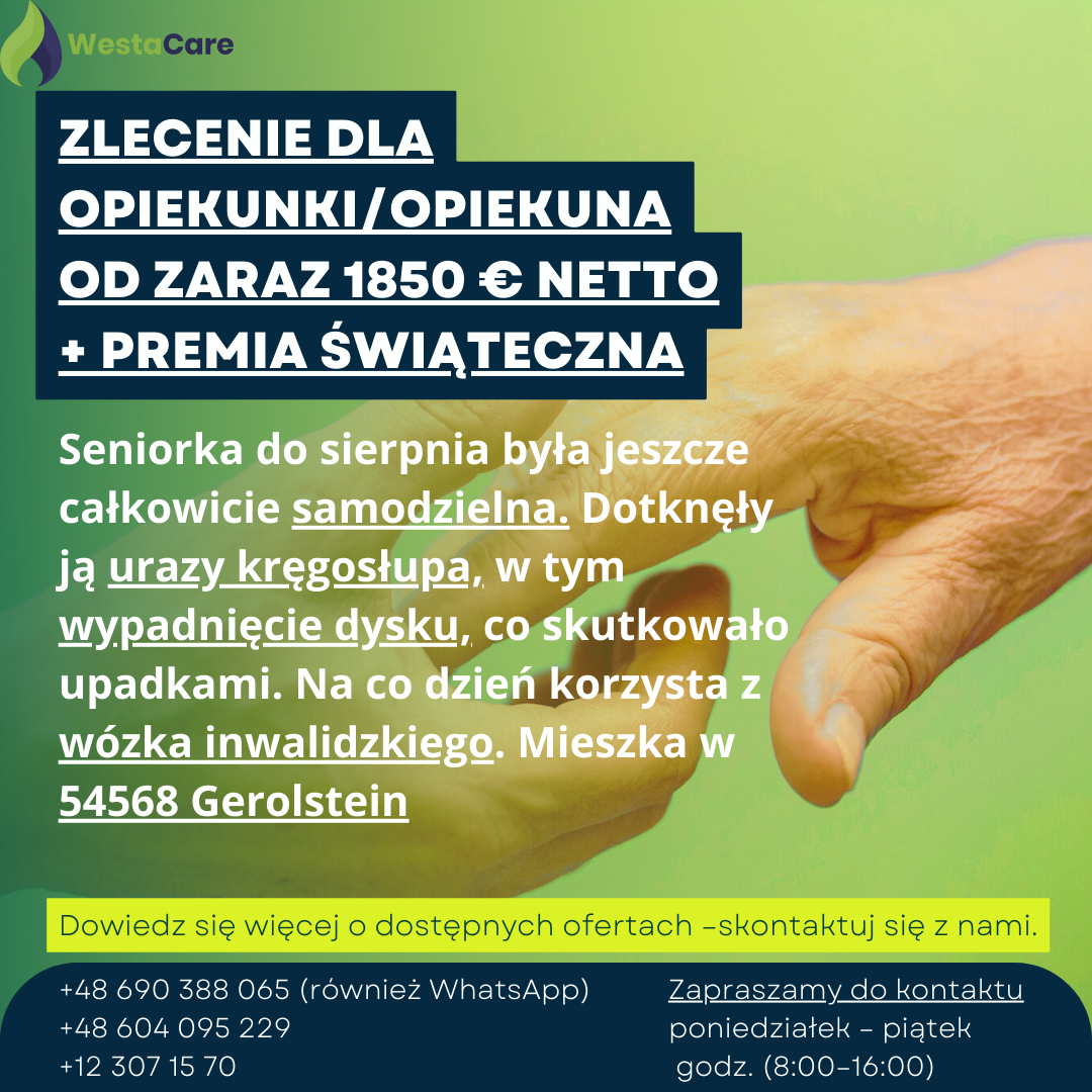 Zlecenie dla Opiekunki/Opiekuna od zaraz 1850 € netto + Premia Świąteczna