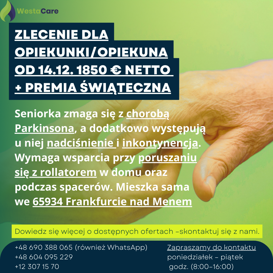 Zlecenie dla Opiekunki/Opiekuna od 14.12. 1850 € netto + Premia Świąteczna