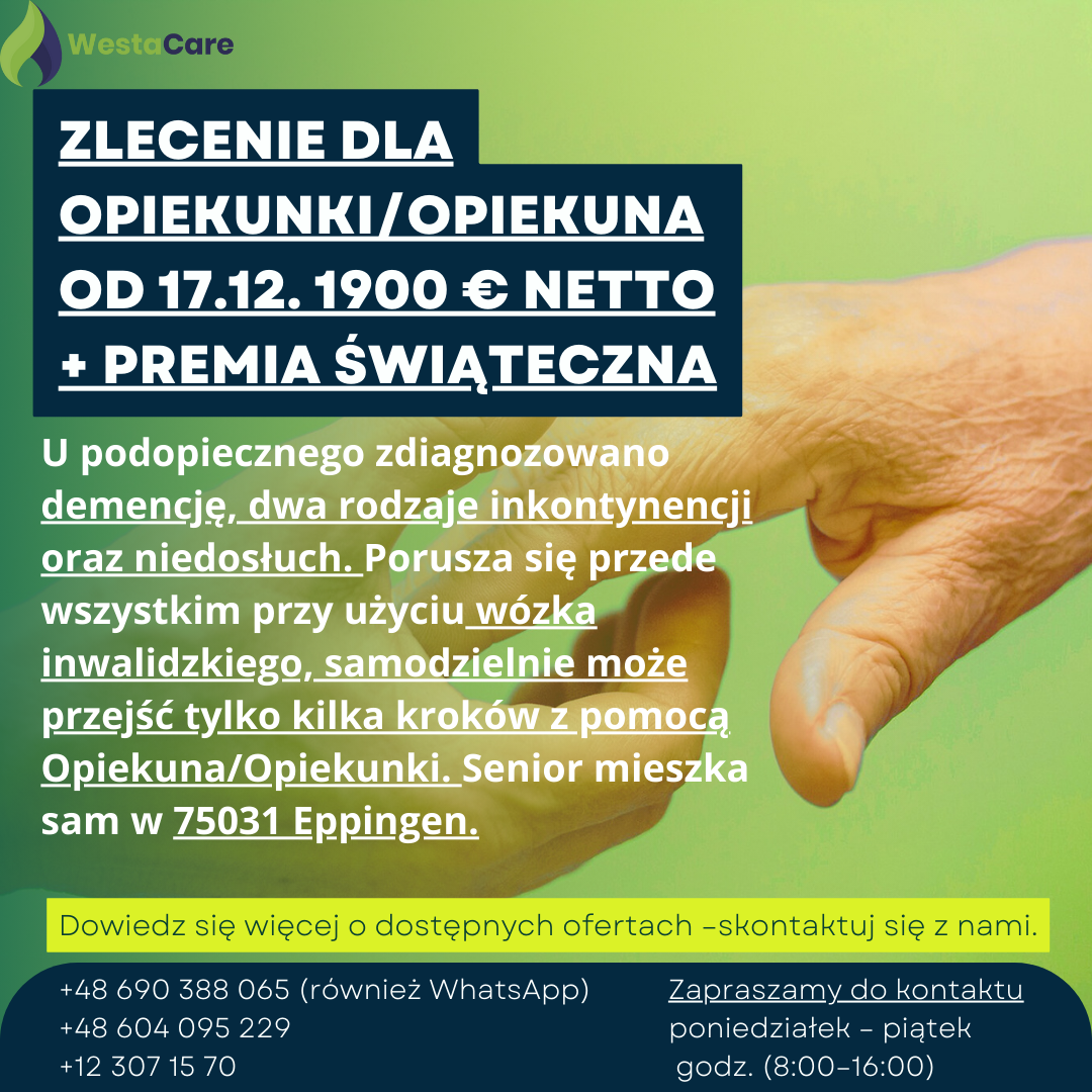Zlecenie dla Opiekunki/Opiekuna od 17.12. 1900 € netto + Premia Świąteczna