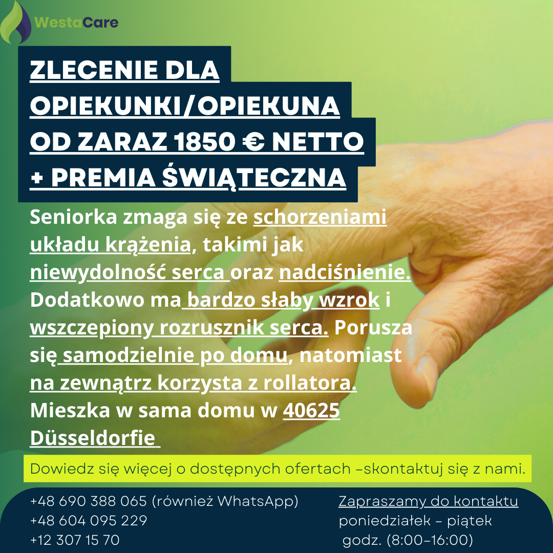 Zlecenie dla Opiekunki/Opiekuna od zaraz 1850 € netto + Premia Świąteczna