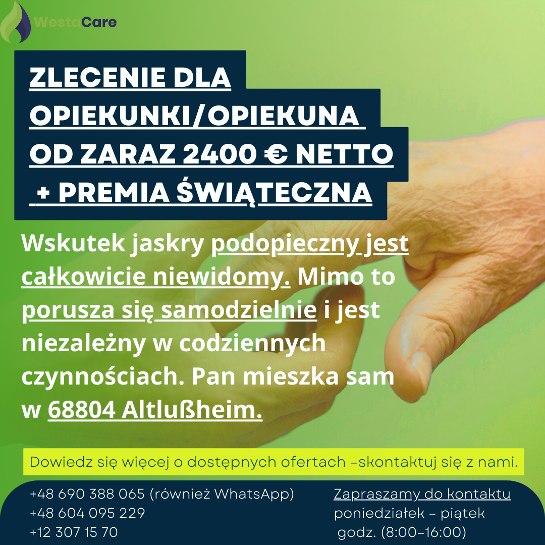 Zlecenie dla Opiekunki/Opiekuna od zaraz 2400 € netto + Premia Świąteczna