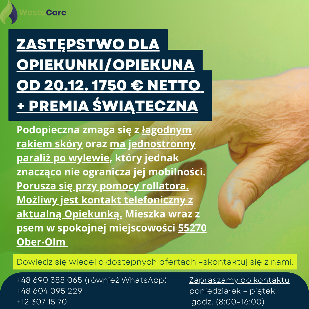 Zastępstwo dla Opiekunki/Opiekuna od 20.12. 1750 € netto + Premia Świąteczna