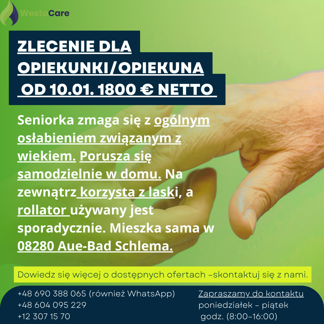Zlecenie dla Opiekunki/Opiekuna od 10.01. 1800 € netto