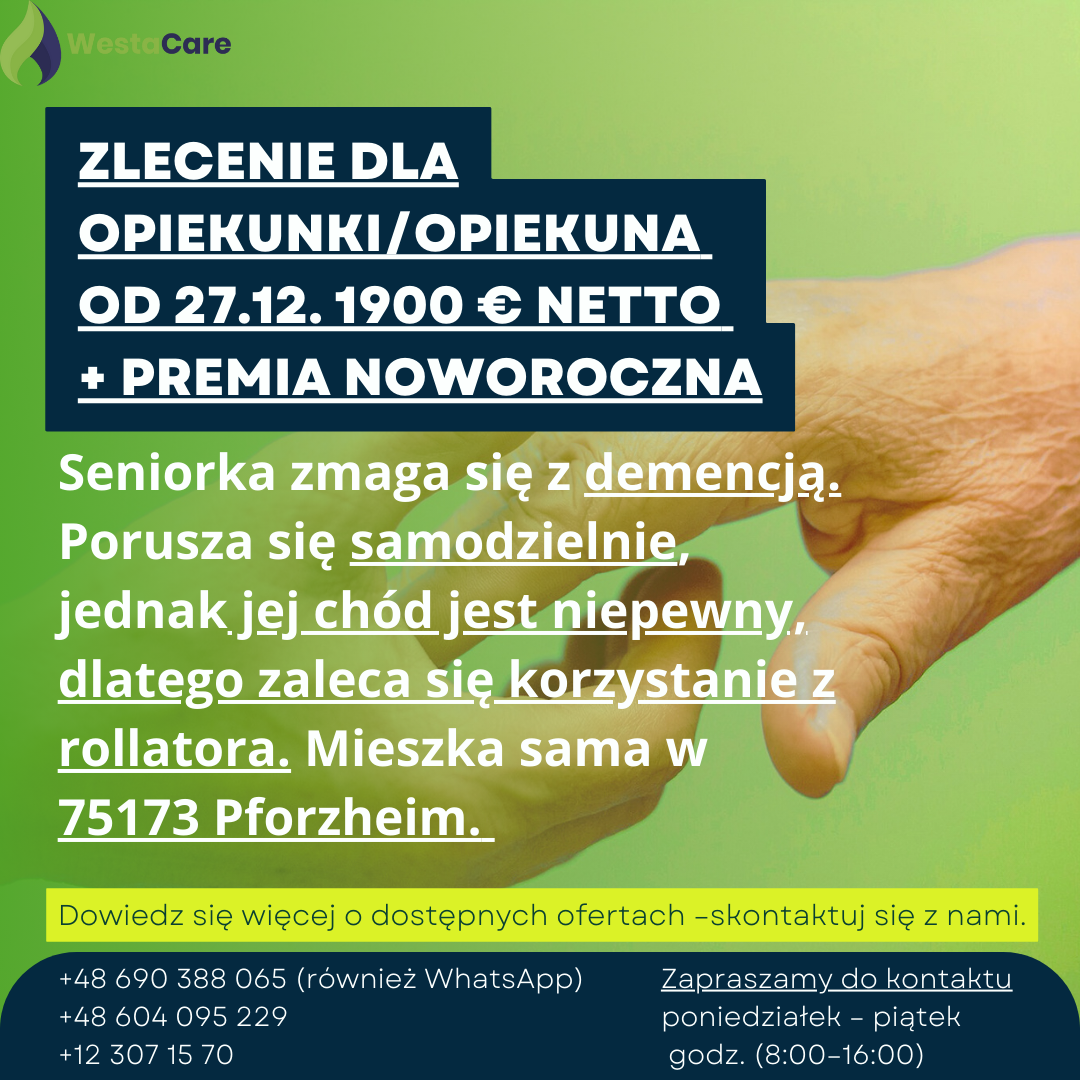 Zlecenie dla Opiekunki/Opiekuna od 27.12. 1900 € netto + Premia Noworoczna