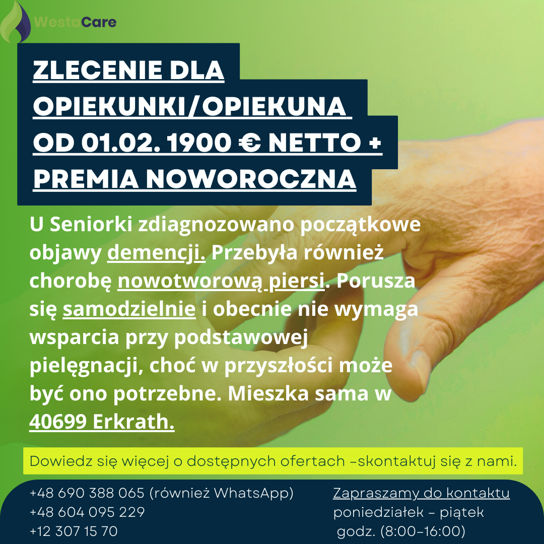 Zlecenie dla Opiekunki/Opiekuna od 01.02. 1900 € netto