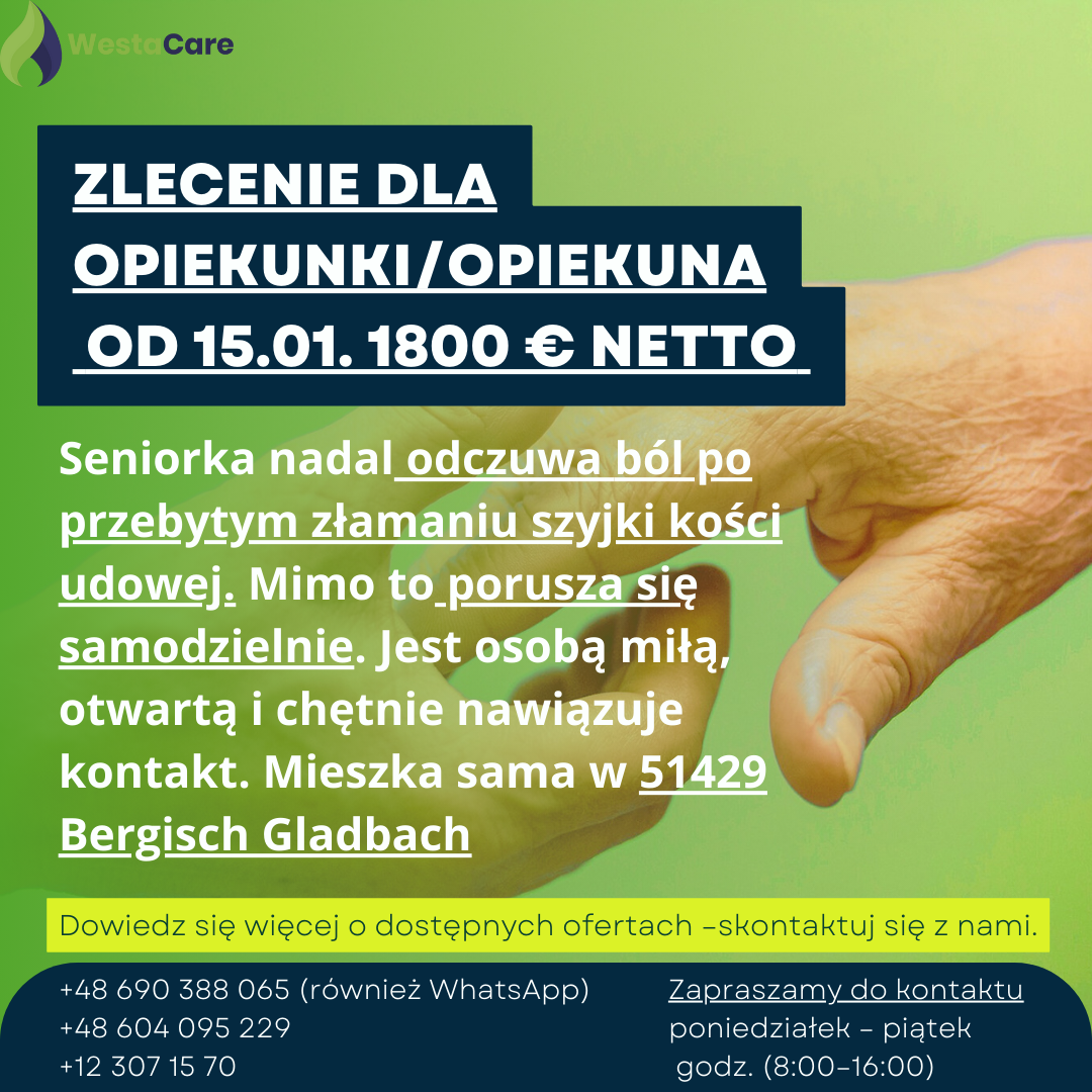 Zlecenie dla Opiekunki/Opiekuna od 15.01. 1800 € netto