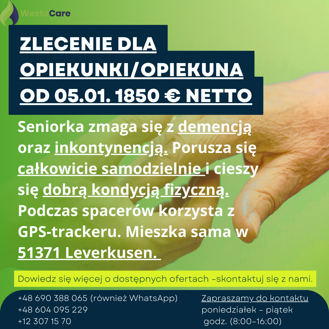 Zlecenie dla Opiekunki/Opiekuna od 05.01. 1850 € netto