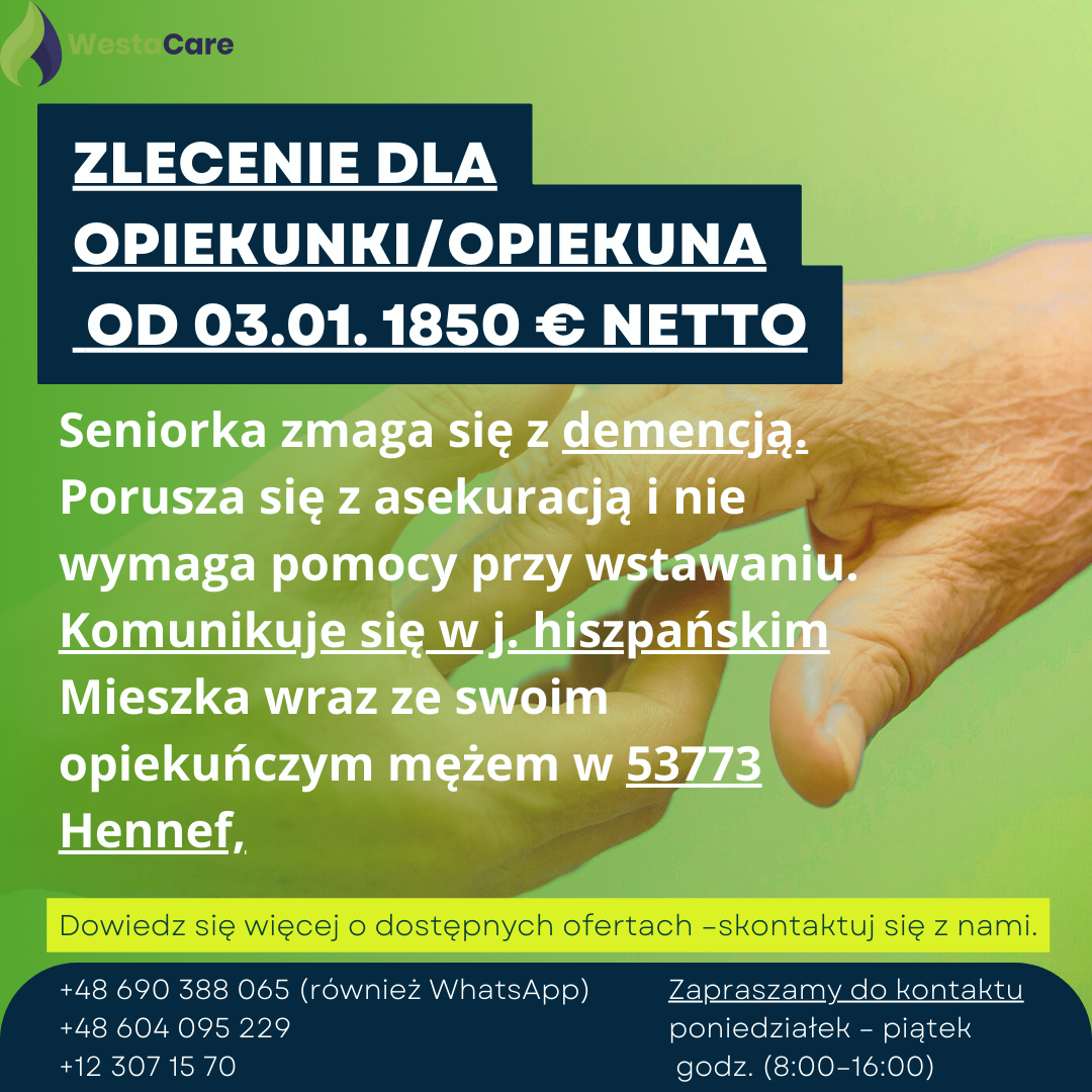 Zlecenie dla Opiekunki/Opiekuna od 03.01. 1850 € netto