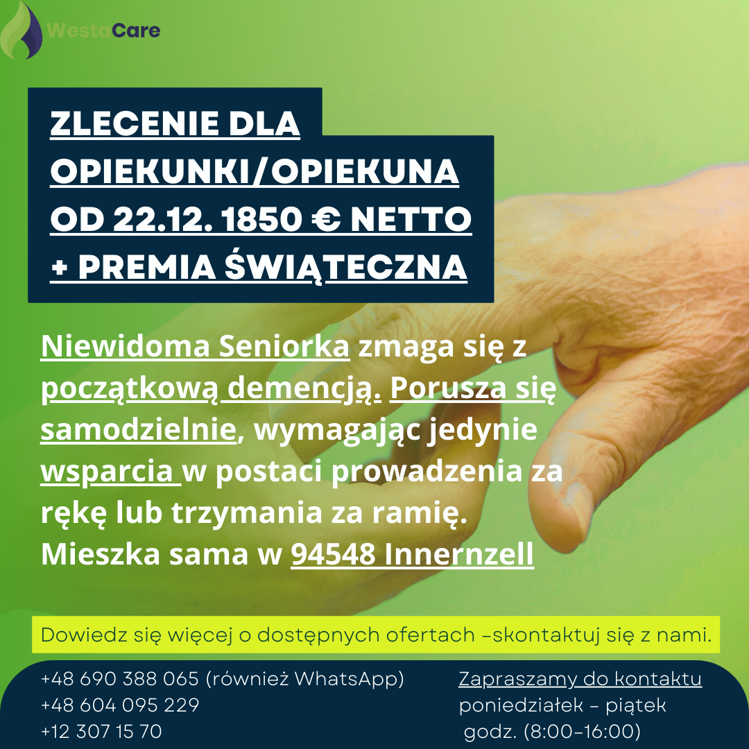 Zlecenie dla Opiekunki/Opiekuna od 22.12. 1850 € netto + Premia Świąteczna