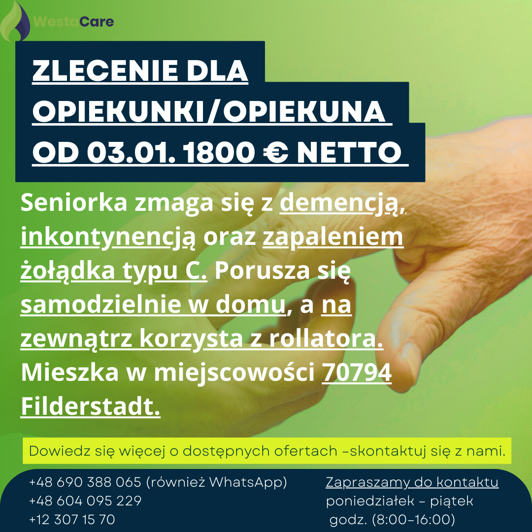 Zlecenie dla Opiekunki/Opiekuna od 03.01. 1800 € netto