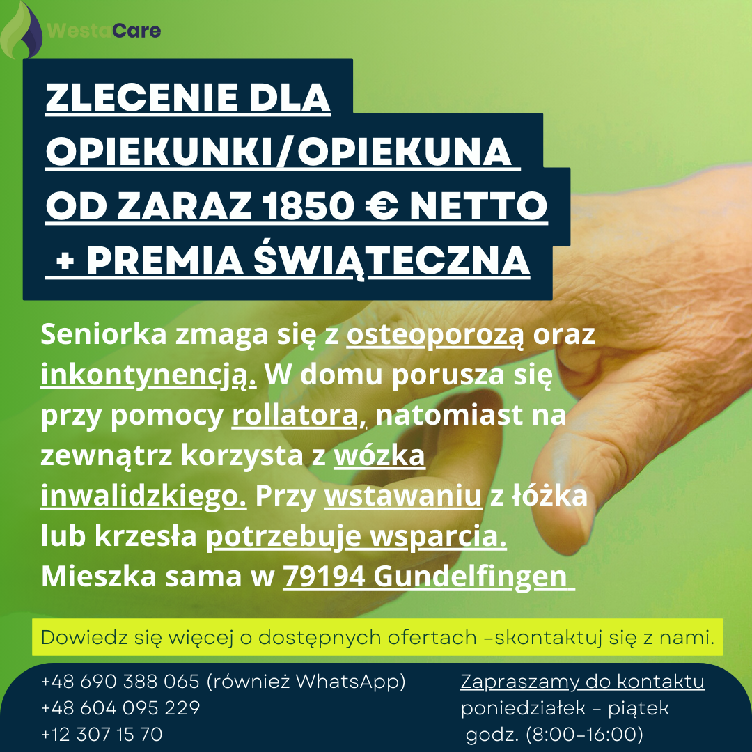 Zlecenie dla Opiekunki/Opiekuna od zaraz 1850 € netto + Premia Świąteczna