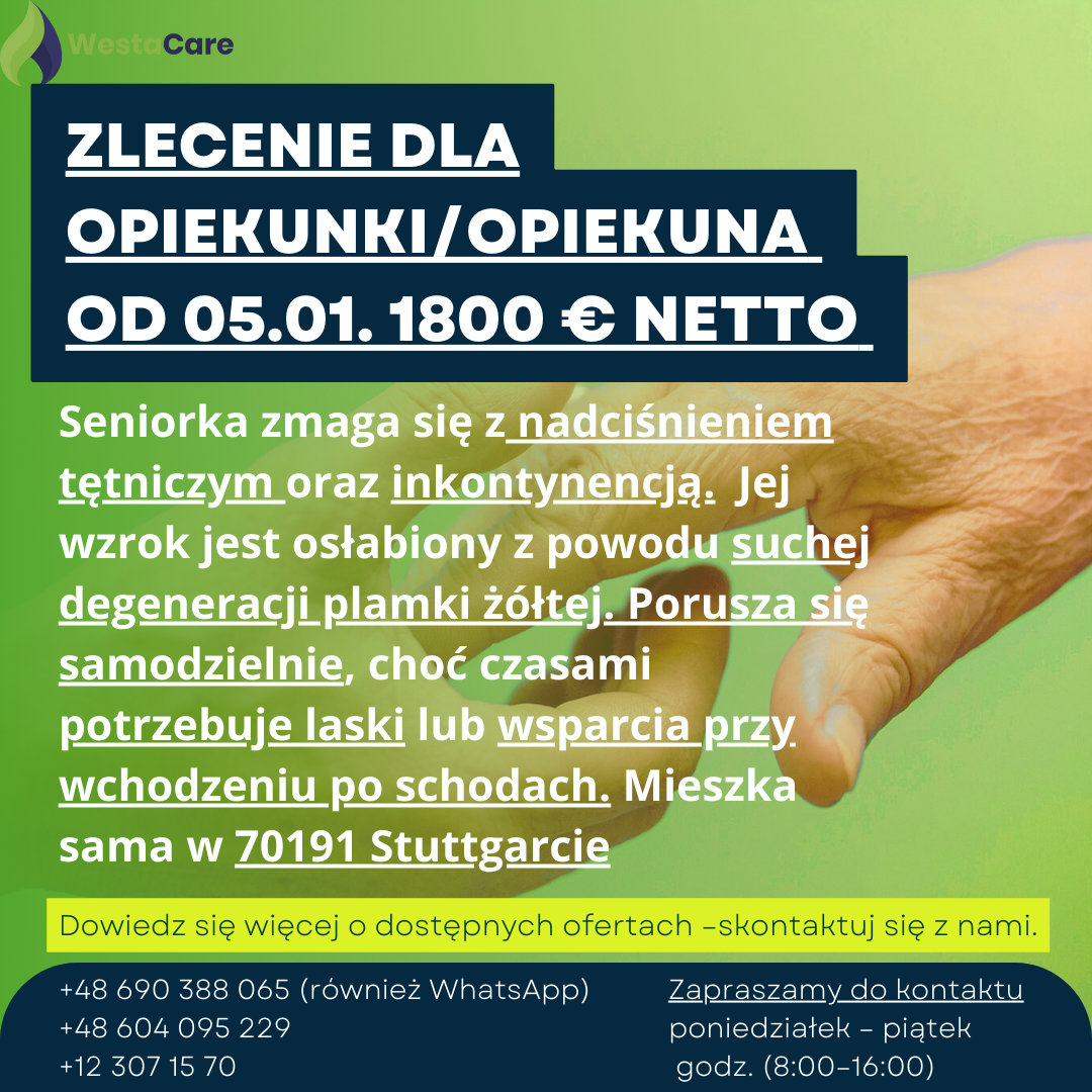Zlecenie dla Opiekunki/Opiekuna od 05.01. 1800 € netto