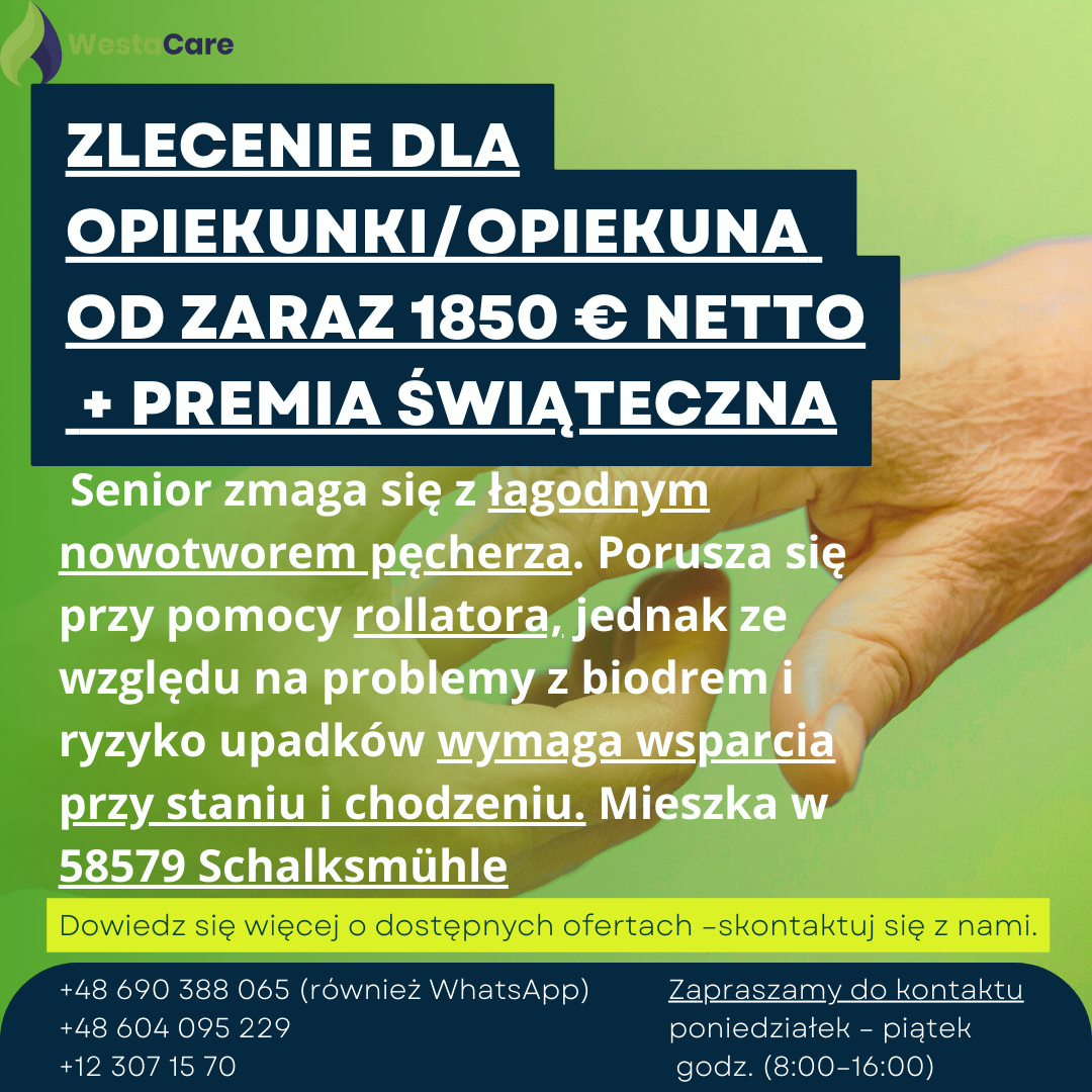 Zlecenie dla Opiekunki/Opiekuna od zaraz 1850 € netto + Premia Świąteczna