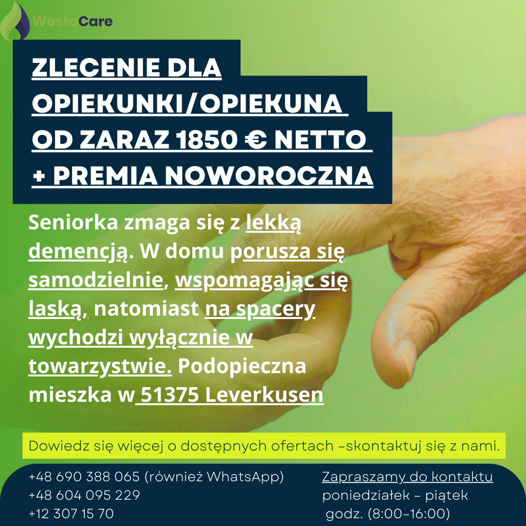 Zlecenie dla Opiekunki/Opiekuna od zaraz 1850 € netto + Premia Noworoczna
