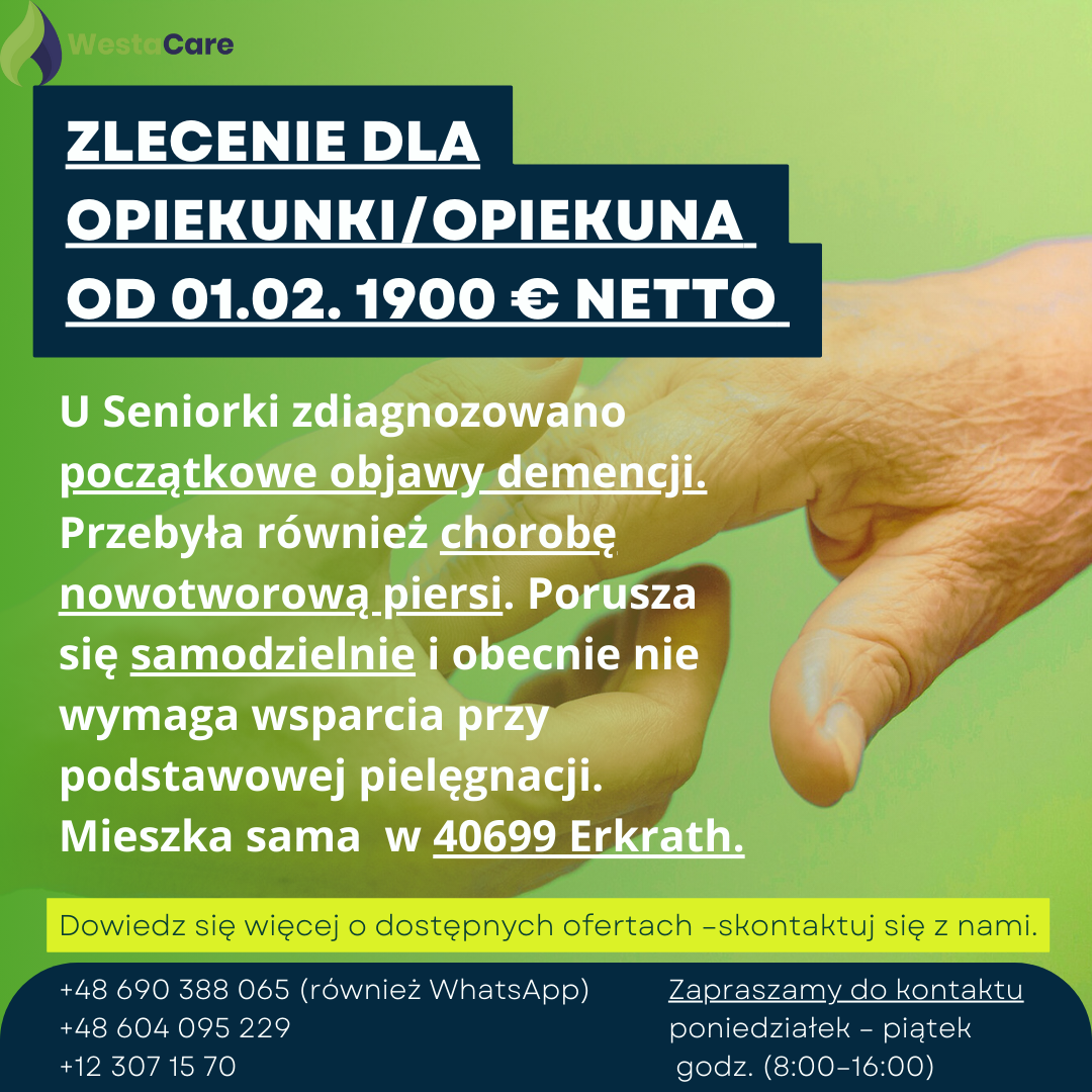 Zlecenie dla Opiekunki/Opiekuna od 01.02. 1900 € netto