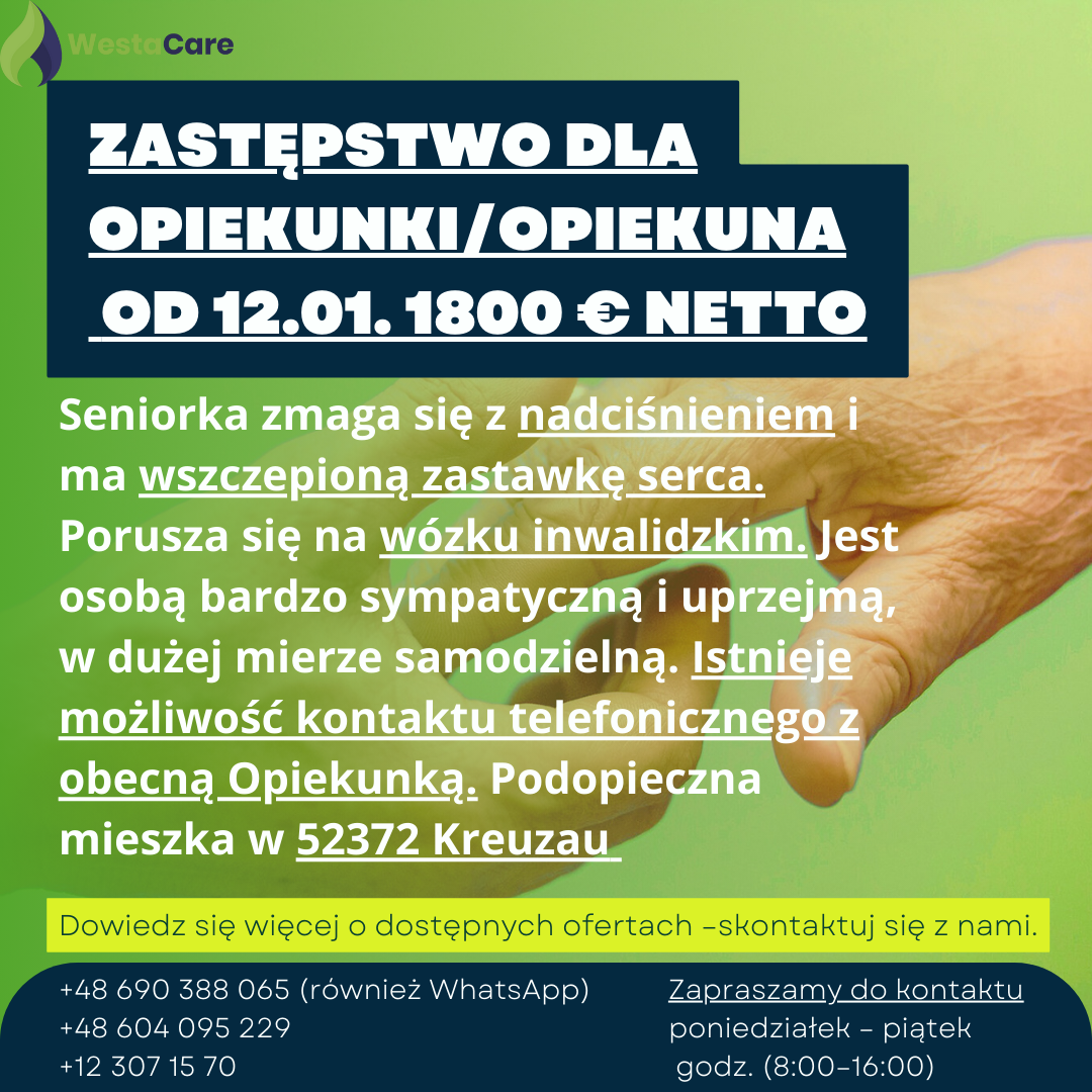Zastępstwo dla Opiekunki/Opiekuna od 12.01. 1800 € netto