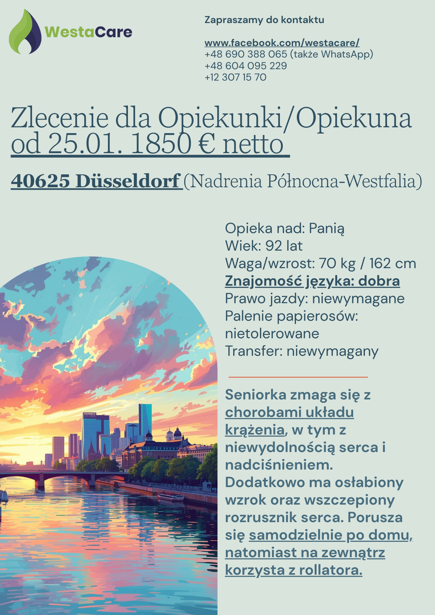 Podopieczna mieszka sama w domu w 40625 Düsseldorfie – pięknym, tętniącym życiem mieście nad Renem, słynącym z malowniczych bulwarów, licznych parków i urokliwego starego miasta. W okolicy znajdują się sklepy codziennego użytku, kawiarnie i restauracje, a pobliskie miejscowości, takie jak Neuss czy Ratingen, są łatwo dostępne. To doskonałe miejsce do spacerów, spotkań towarzyskich i spokojnego życia. Dla Opiekuna lub Opiekunki przygotowano komfortowy, w pełni wyposażony pokój gościnny z dostępem do internetu.