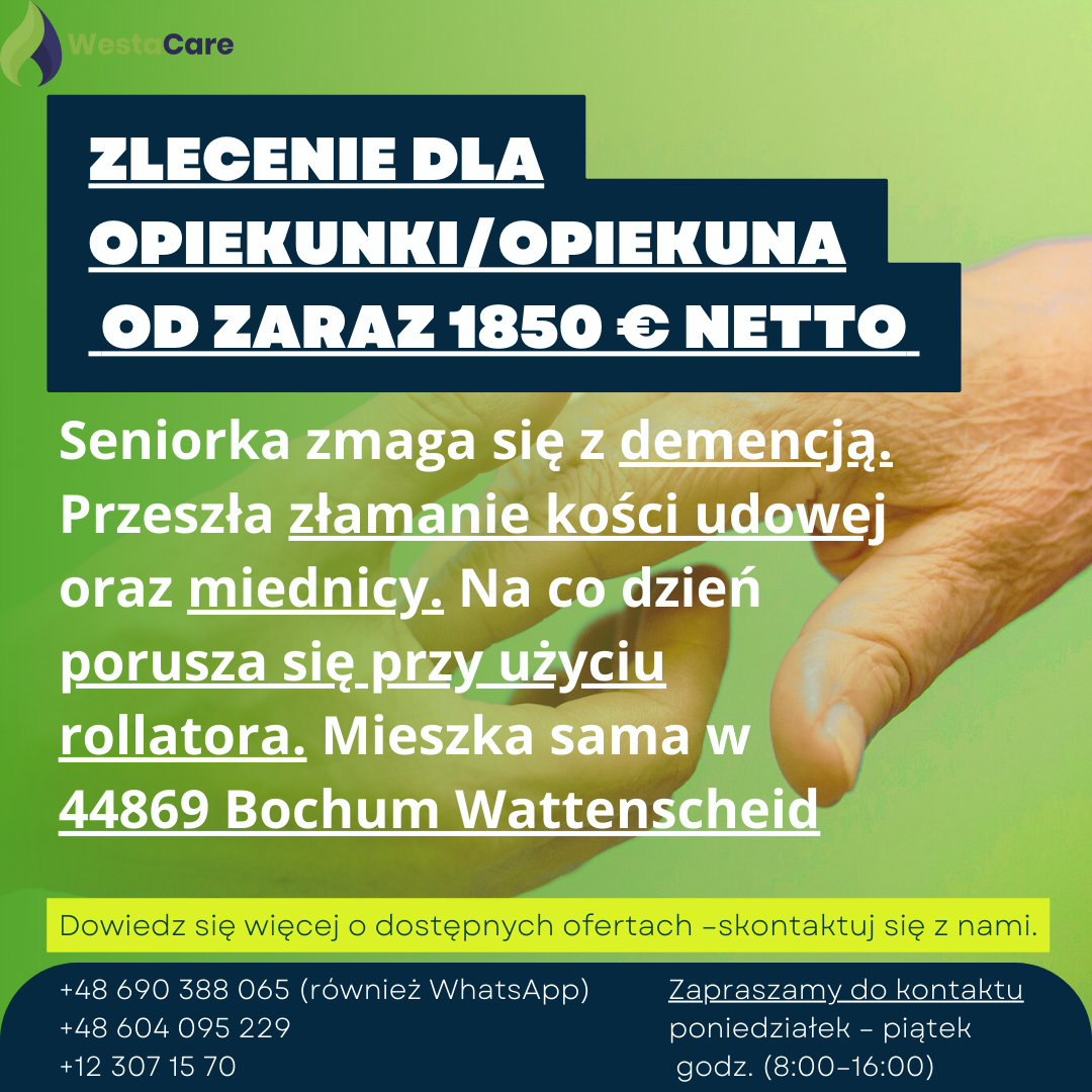 Zlecenie dla Opiekunki/Opiekuna od zaraz 1850 € netto