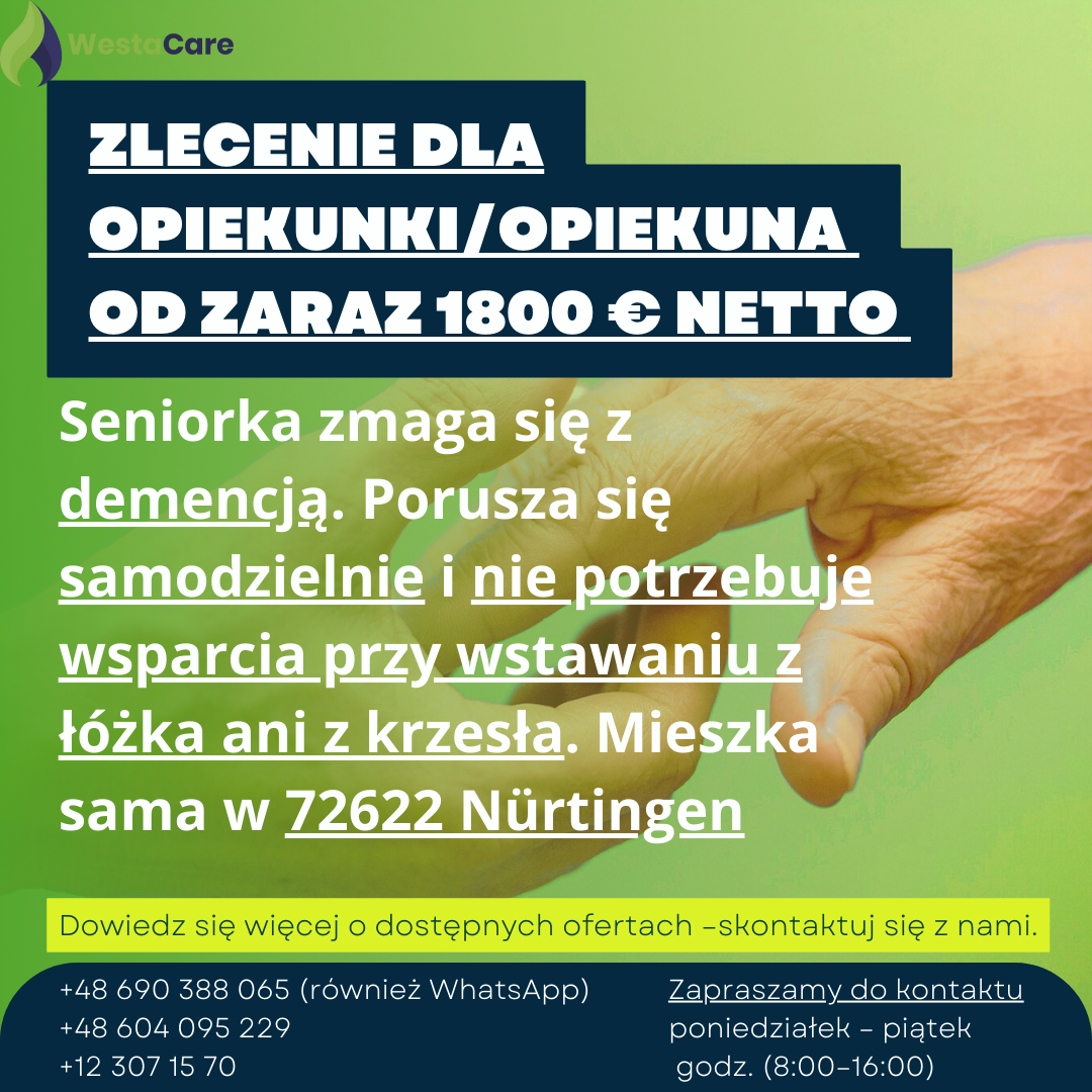 Zlecenie dla Opiekunki/Opiekuna od zaraz 1800 € netto