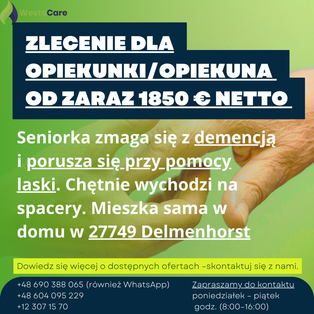 Zlecenie dla Opiekunki/Opiekuna od zaraz 1850 € netto