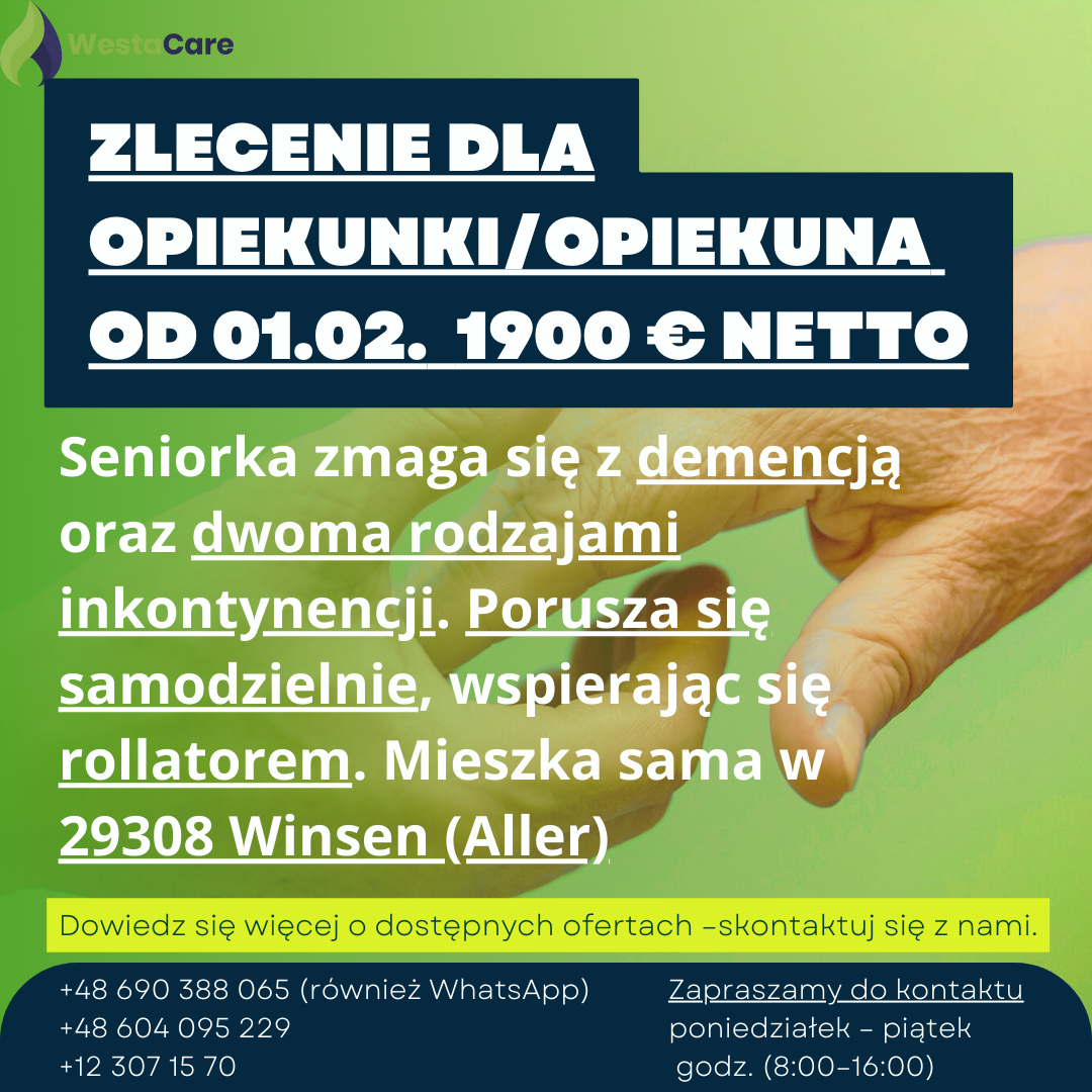 Zlecenie dla Opiekunki/Opiekuna od 01.02. 1900 € netto