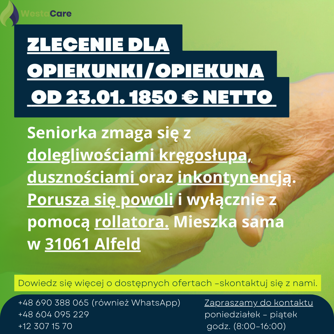 Zlecenie dla Opiekunki/Opiekuna od 23.01. 1850 € netto