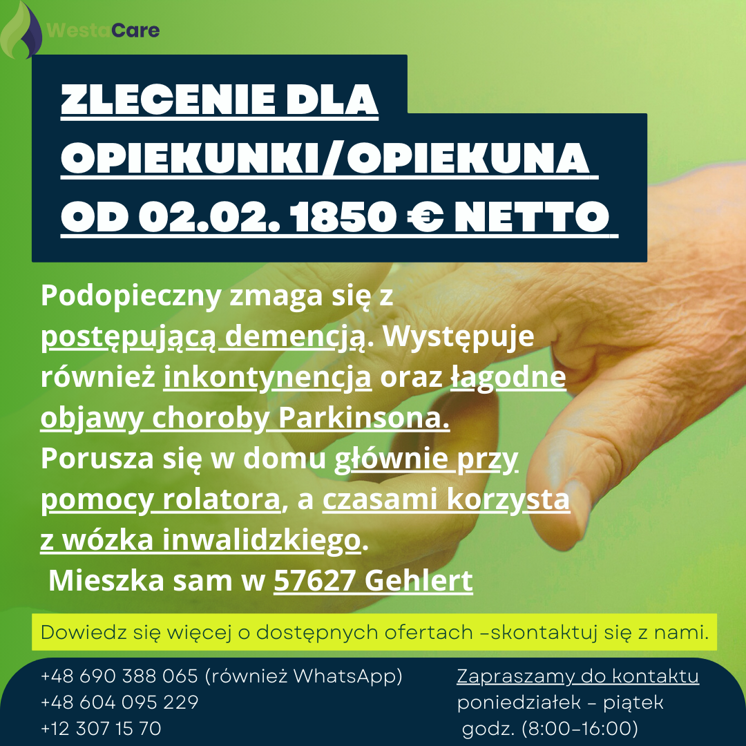 Zlecenie dla Opiekunki/Opiekuna od 02.02. 1850 € netto