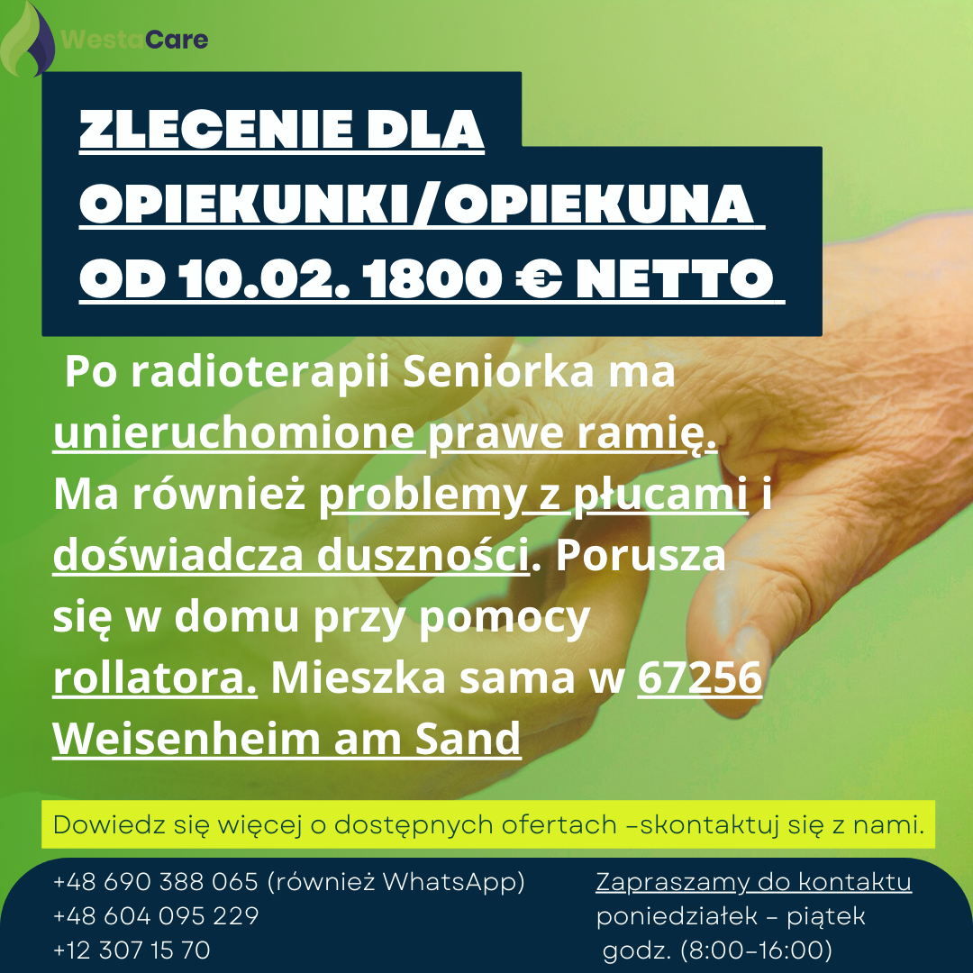 Zlecenie dla Opiekunki/Opiekuna od 10.02. 1800 € netto