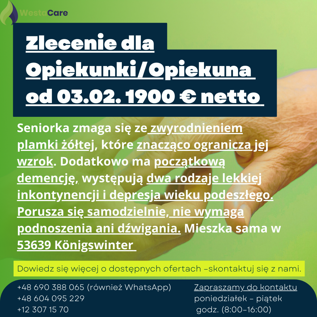 Zlecenie dla Opiekunki/Opiekuna od 03.02. 1900 € netto
