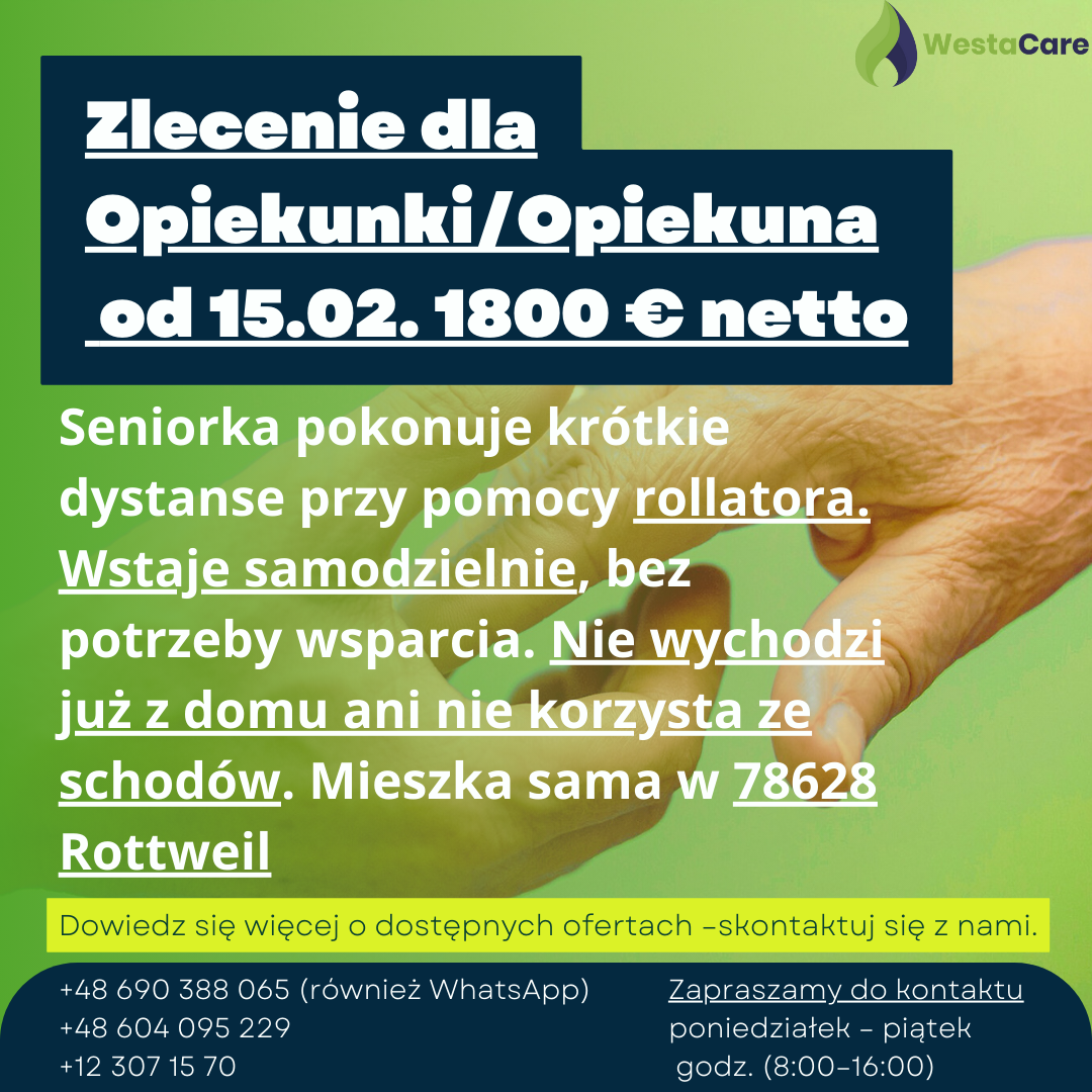Zlecenie dla Opiekunki/Opiekuna od 15.02. 1800 € netto