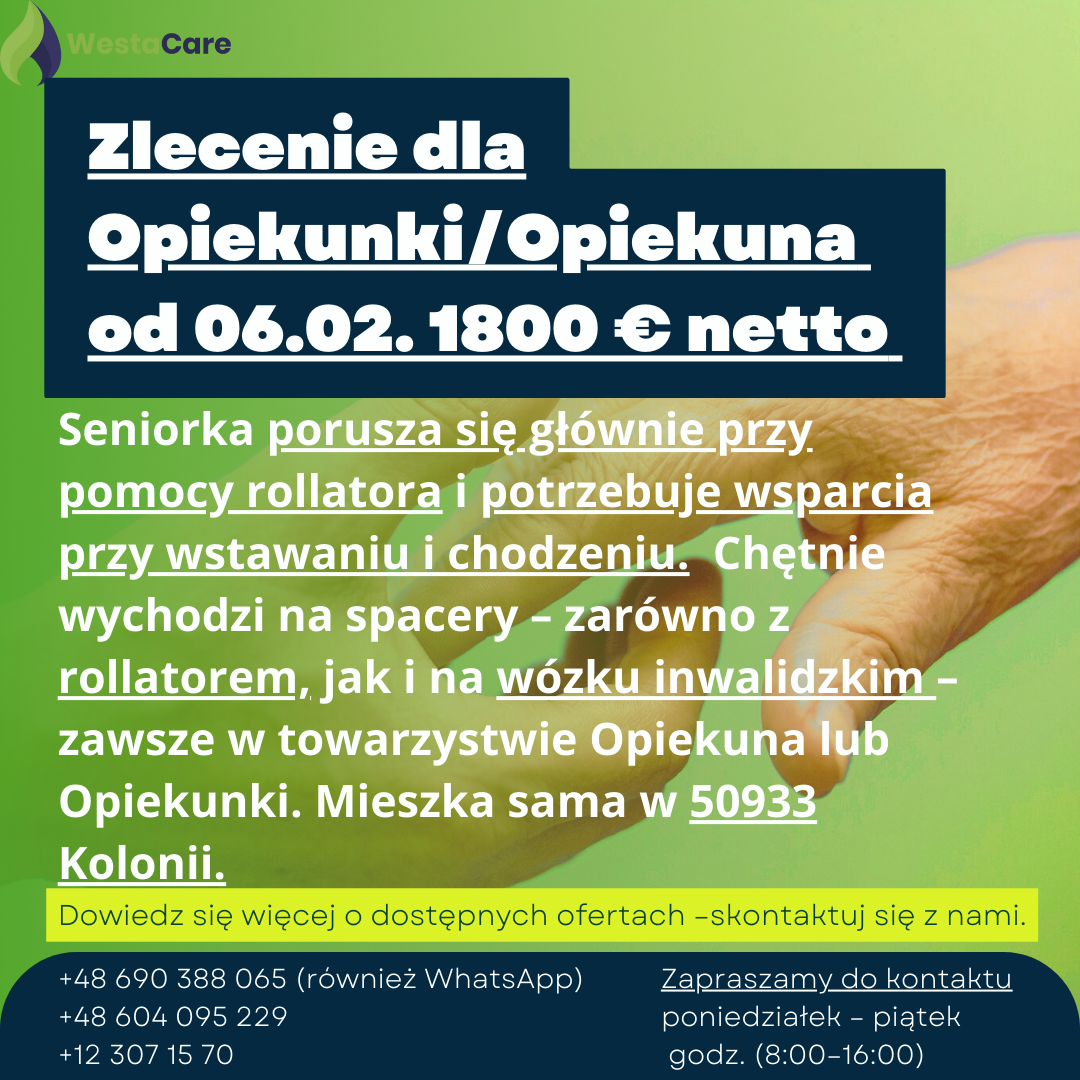 Zlecenie dla Opiekunki/Opiekuna od 06.02. 1800 € netto