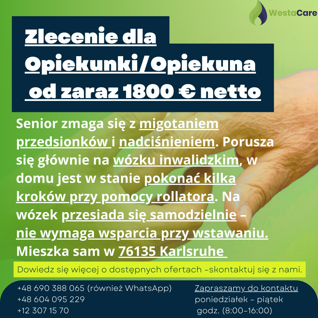 Zlecenie dla Opiekunki/Opiekuna od zaraz 1800 € netto