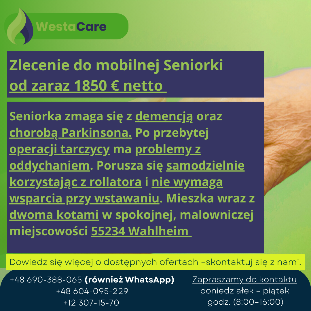 Zlecenie do mobilnej Seniorki od zaraz 1850 € netto