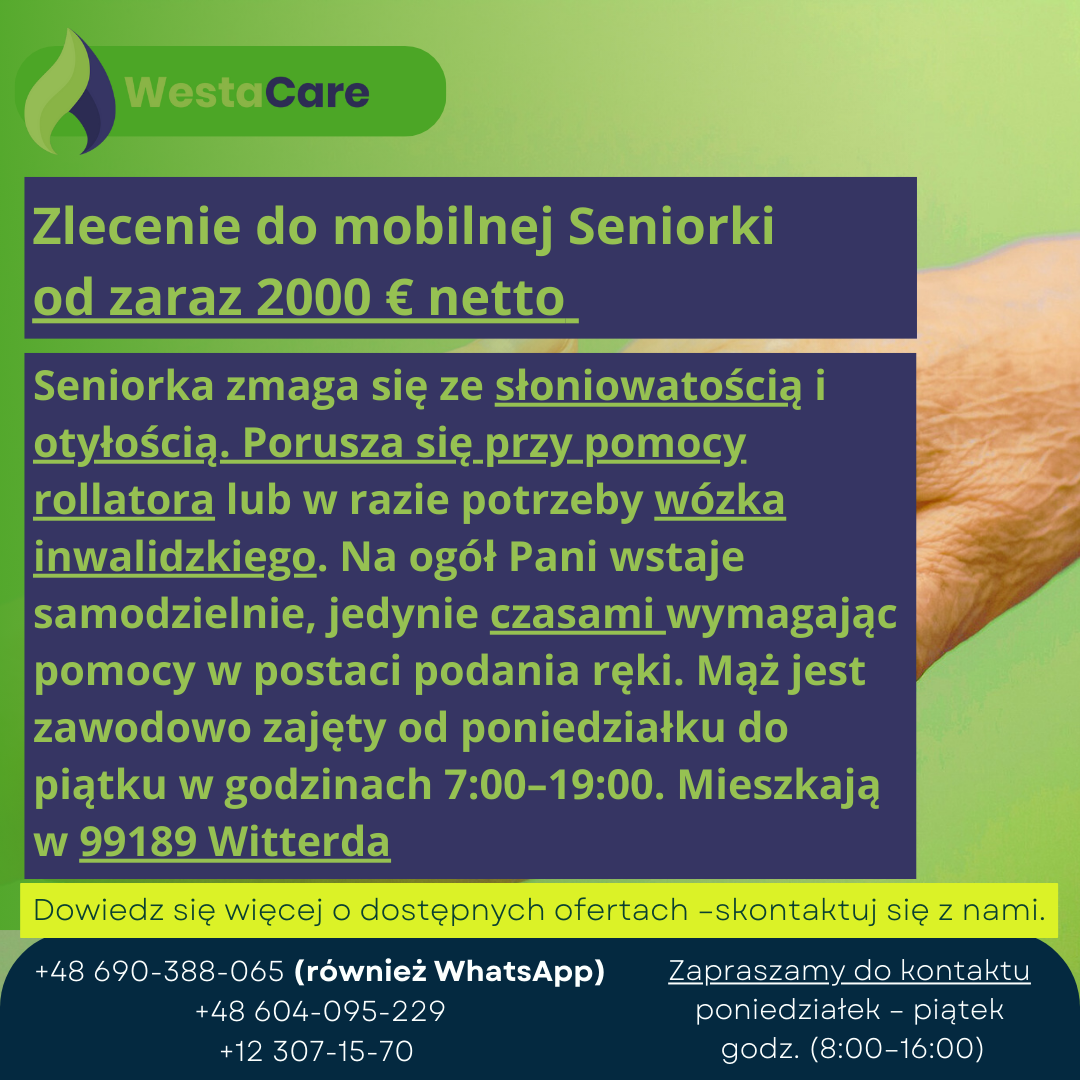 Zlecenie do mobilnej Seniorki od zaraz 2000 € netto
