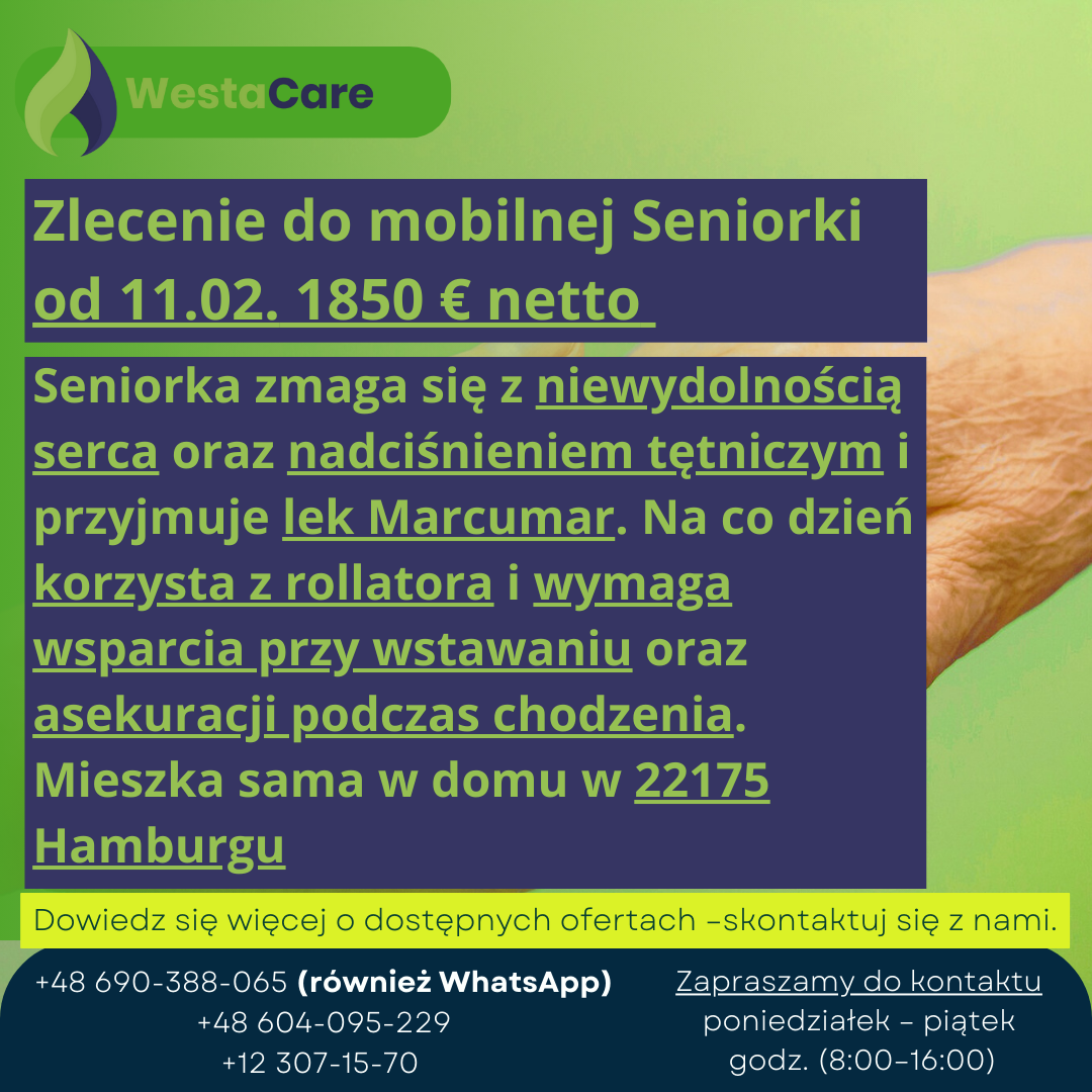 Seniorka zmaga się z niewydolnością serca oraz nadciśnieniem tętniczym i przyjmuje lek Marcumar. Dodatkowo występują u niej zawroty głowy oraz zaburzenia równowagi. Na co dzień korzysta z rollatora i wymaga wsparcia przy wstawaniu oraz asekuracji podczas chodzenia. Mile widziane jest zapewnienie Pani aktywności i wsparcia emocjonalnego, w tym towarzystwa, rozmów, spacerów oraz drobnych zajęć manualnych.