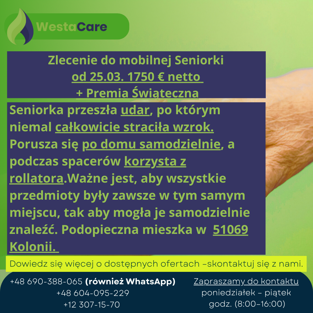 Zlecenie do mobilnej Seniorki od 25.03. 1750 € netto + Premia Świąteczna