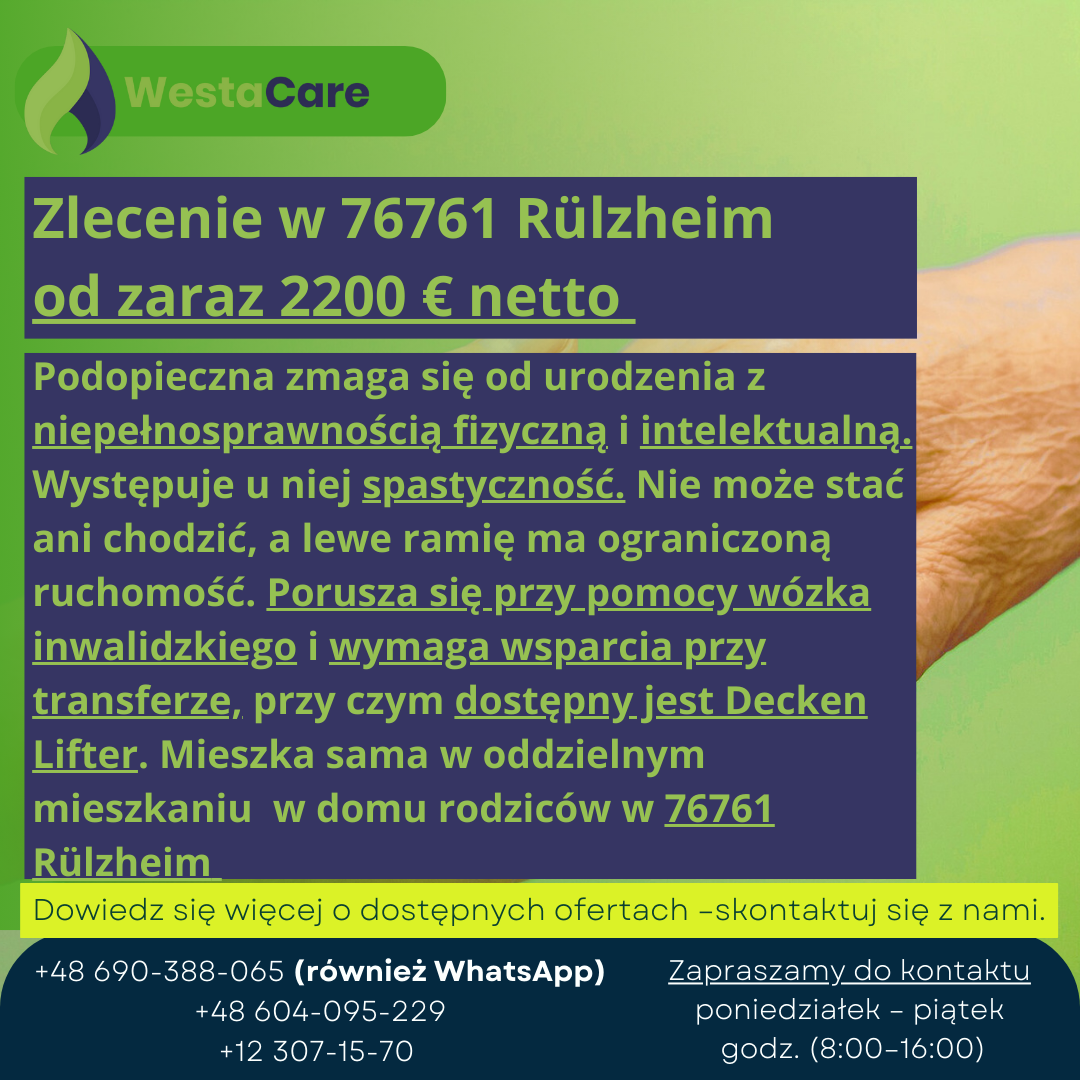 Podopieczna mieszka sama w oddzielnym mieszkaniu o powierzchni 60 m² w domu rodziców w 76761 Rülzheim. To spokojna i przyjazna miejscowość w Nadrenii‑Palatynacie. Warto odwiedzić tam St. Egidius Church, spacerować po historycznym centrum miasta czy korzystać z malowniczych tras rowerowych i spacerowych wzdłuż Klingbach. W okolicy są supermarkety i dyskonty, m.in. REWE, EDEKA, Netto i NORMA, a także lokalne minimarkety.