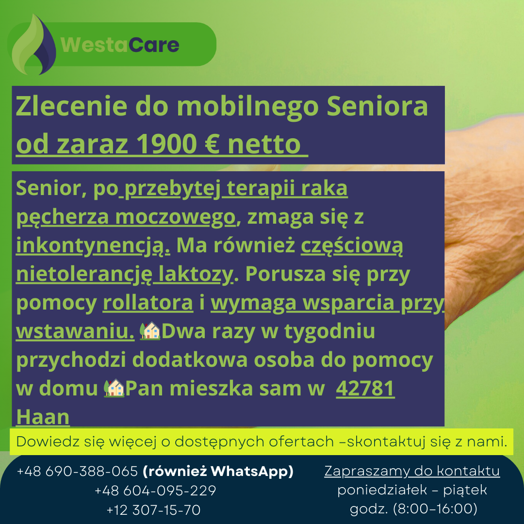 Senior, po przebytej terapii raka pęcherza moczowego, zmaga się z inkontynencją. Ma również częściową nietolerancję laktozy. Porusza się przy pomocy rollatora i wymaga wsparcia przy wstawaniu. Samodzielnie wykonuje codzienną higienę osobistą. Należy towarzyszyć Panu podczas wizyt lekarskich.