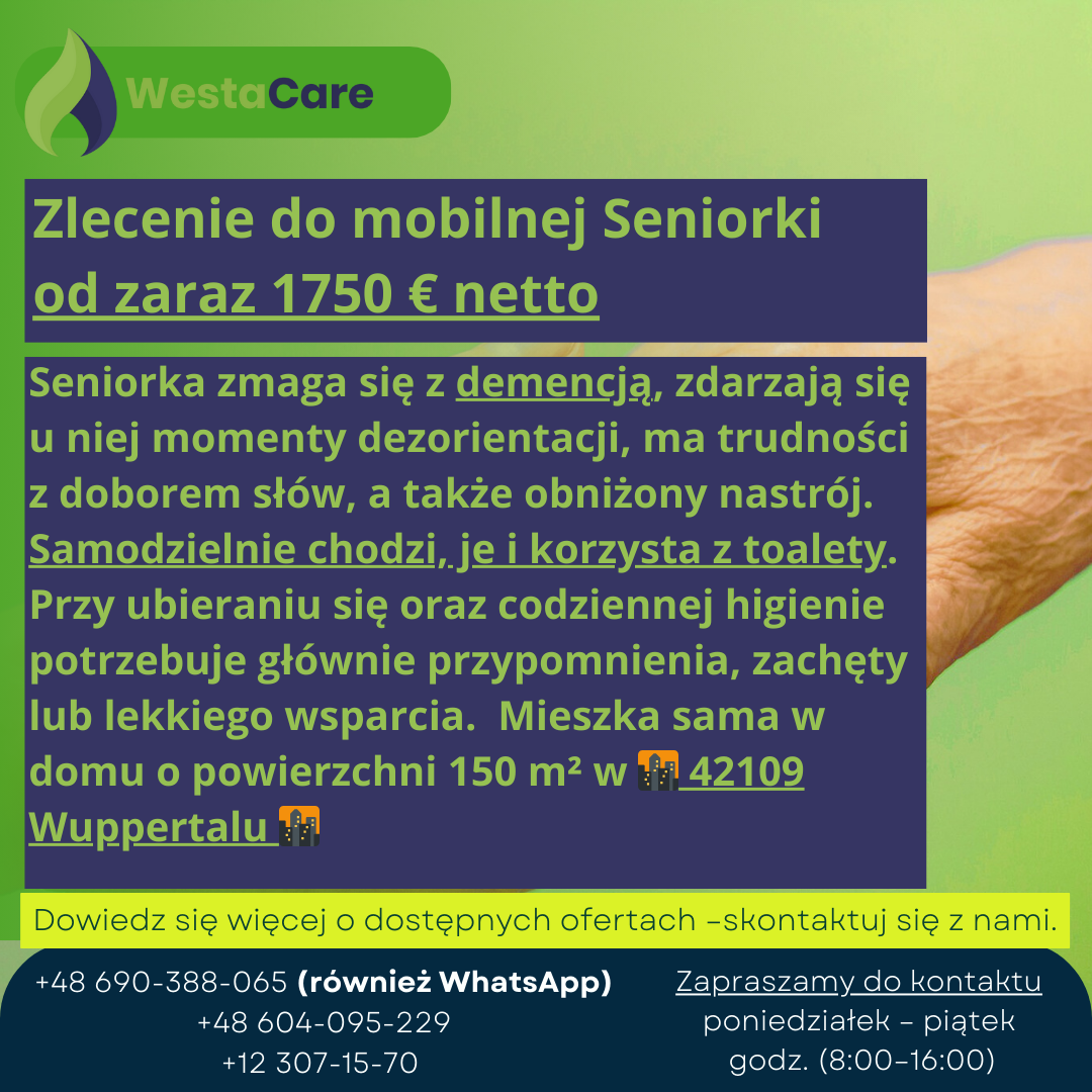 Zlecenie do mobilnej Seniorki od zaraz 1750 € netto
