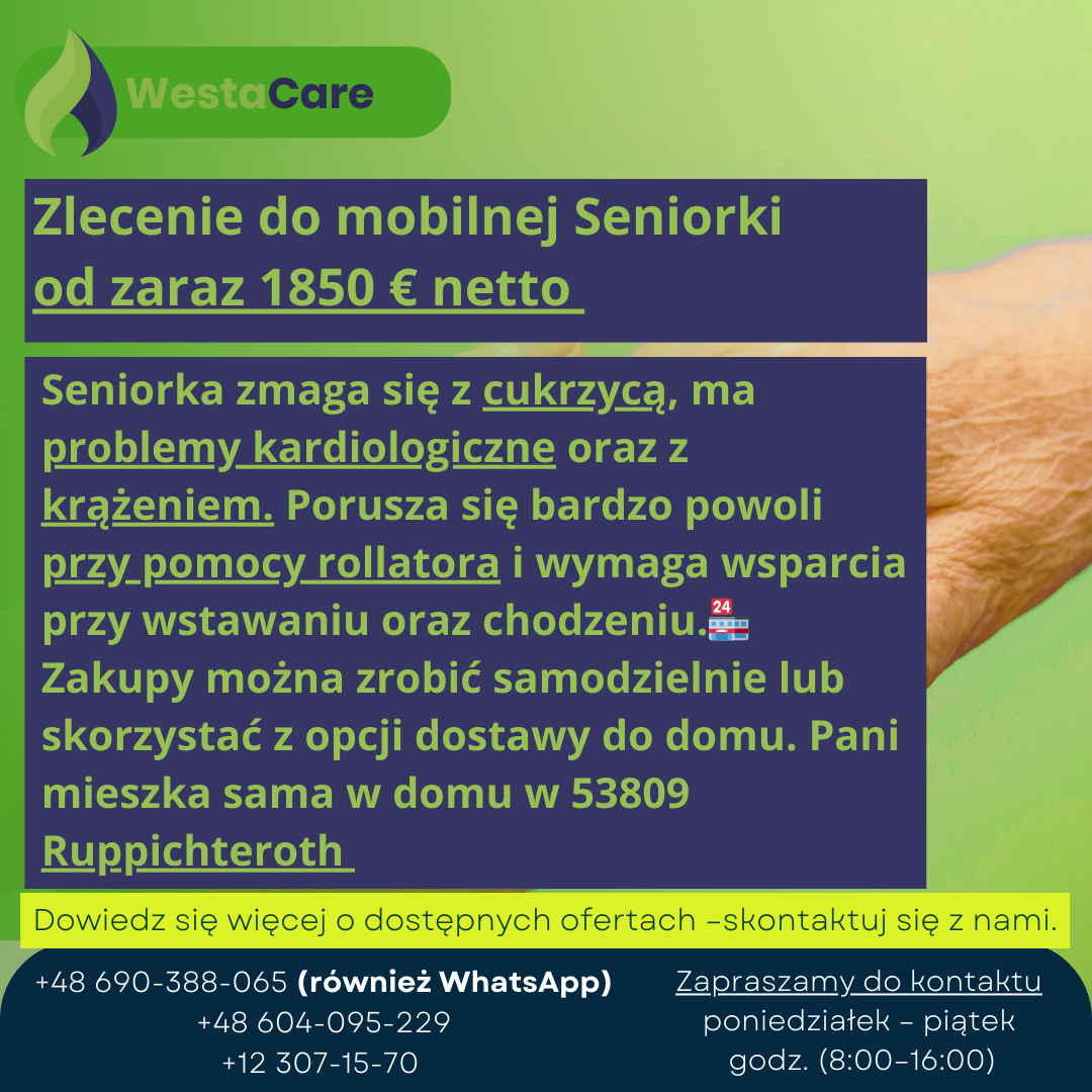Zlecenie do mobilnej Seniorki od zaraz 1850 € netto
