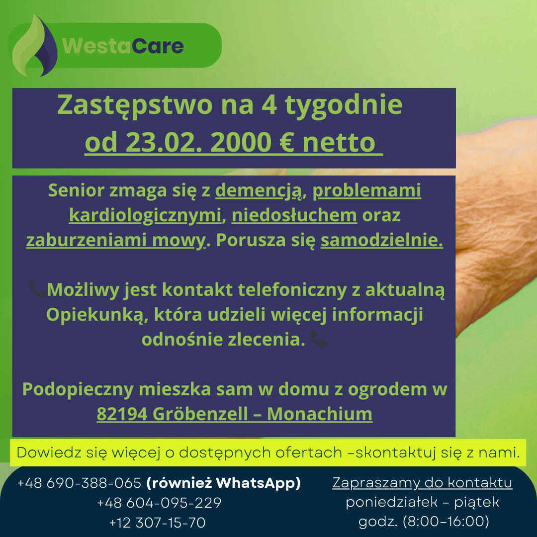 Podopieczny mieszka sam w domu z ogrodem w 82194 Gröbenzell – Monachium, spokojnej i zielonej okolicy, idealnej do codziennych spacerów i relaksu na świeżym powietrzu 🌳☀️. Dla Opiekuna lub Opiekunki przygotowano komfortowy, w pełni wyposażony pokój gościnny z dostępem do internetu.