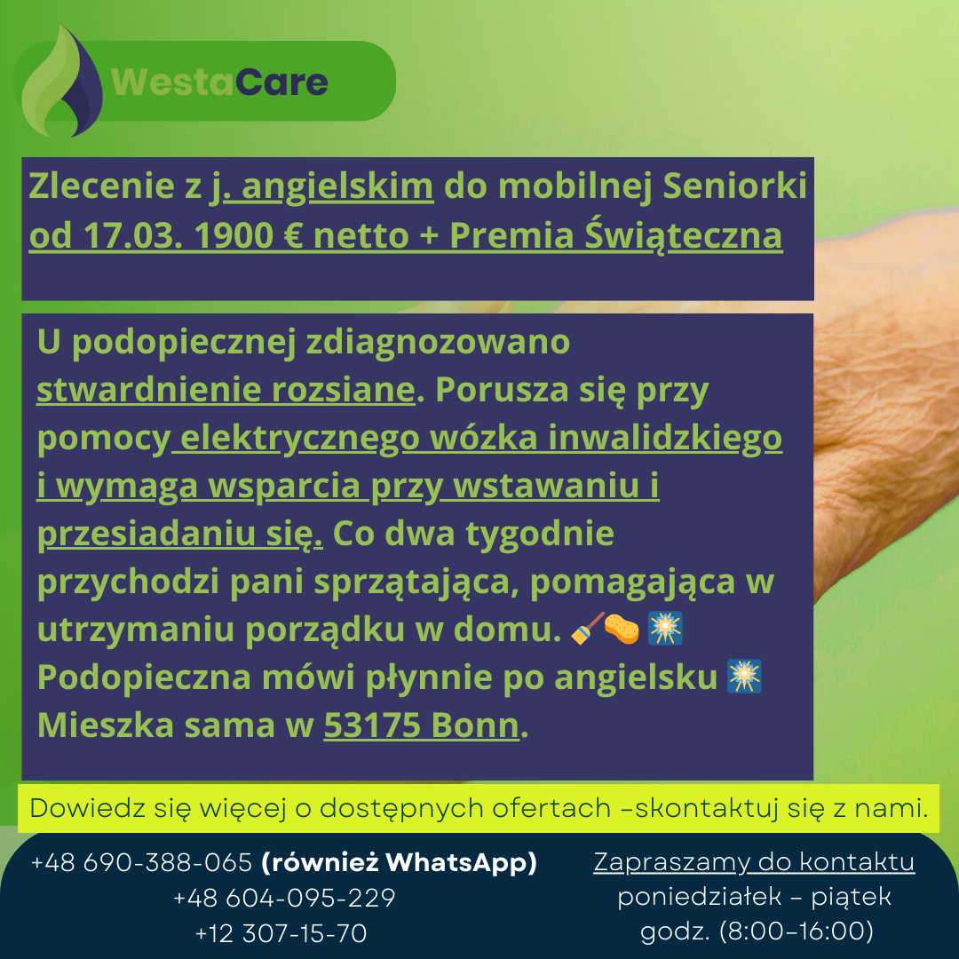 Zlecenie z j. angielskim do mobilnej Seniorki od 17.03. 1900 € netto + Premia Świąteczna