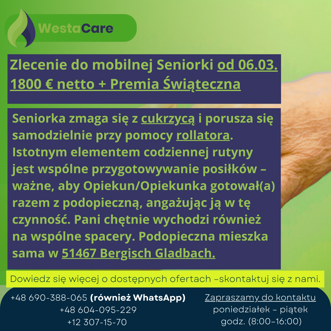 Zlecenie do mobilnej Seniorki od 06.03. 1800 € netto + Premia Świąteczna