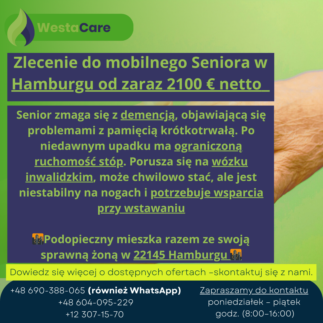 Zlecenie do mobilnego Seniora w Hamburgu od zaraz 2100 € netto