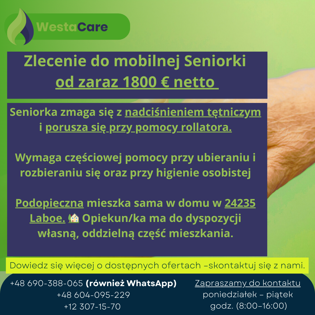 Zlecenie do mobilnej Seniorki od zaraz 1800 € netto