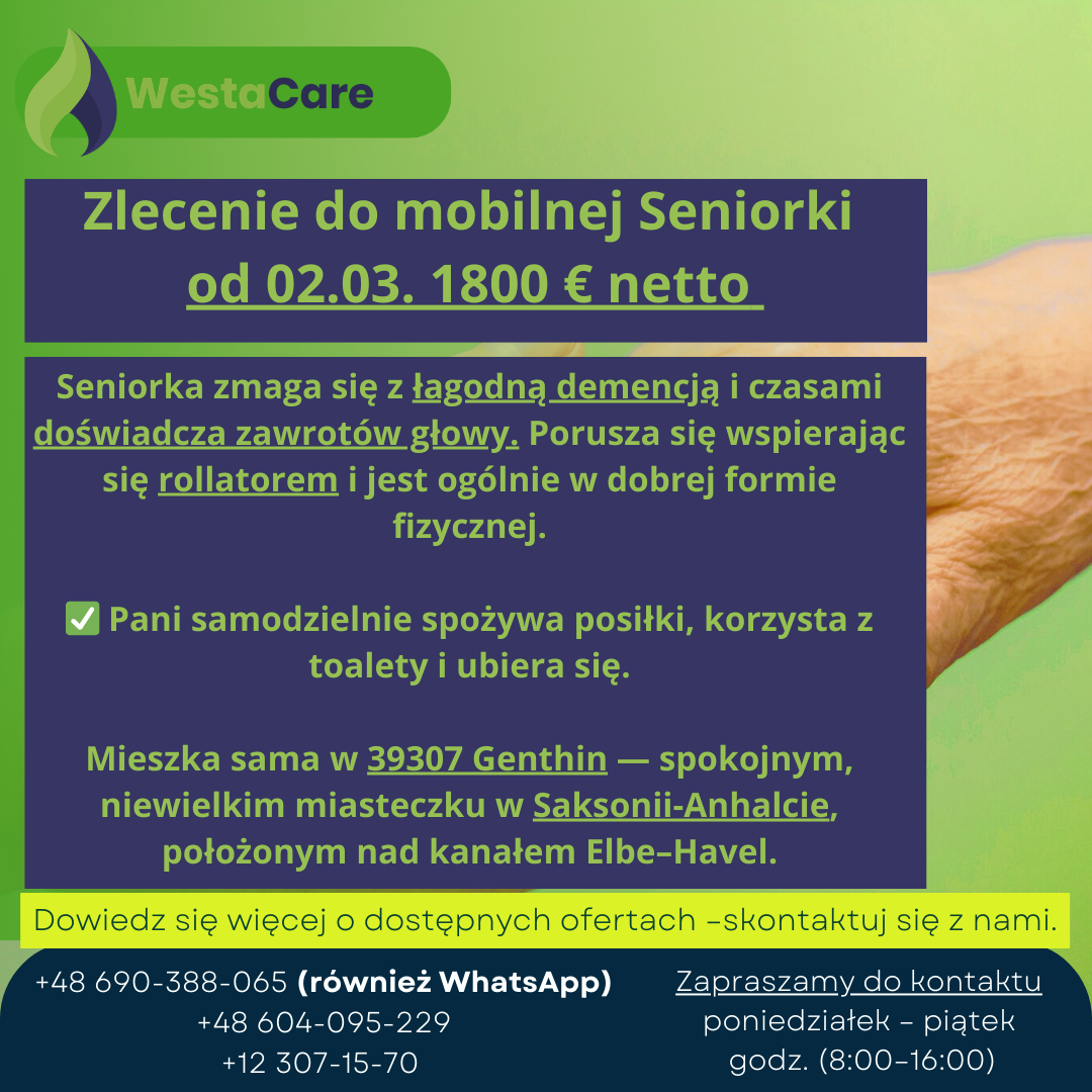 Zlecenie do mobilnej Seniorki od 02.03. 1800 € netto