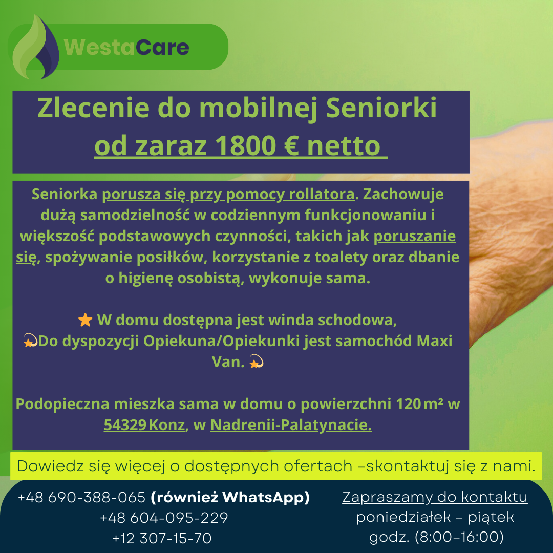 Zlecenie do mobilnej Seniorki od zaraz 1800 € netto