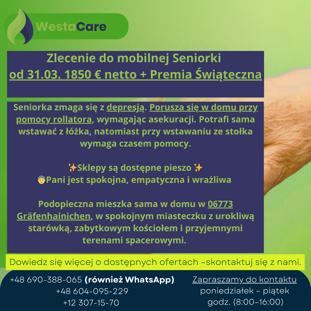 Zlecenie do mobilnej Seniorki od 31.03. 1850 € netto + Premia Świąteczna