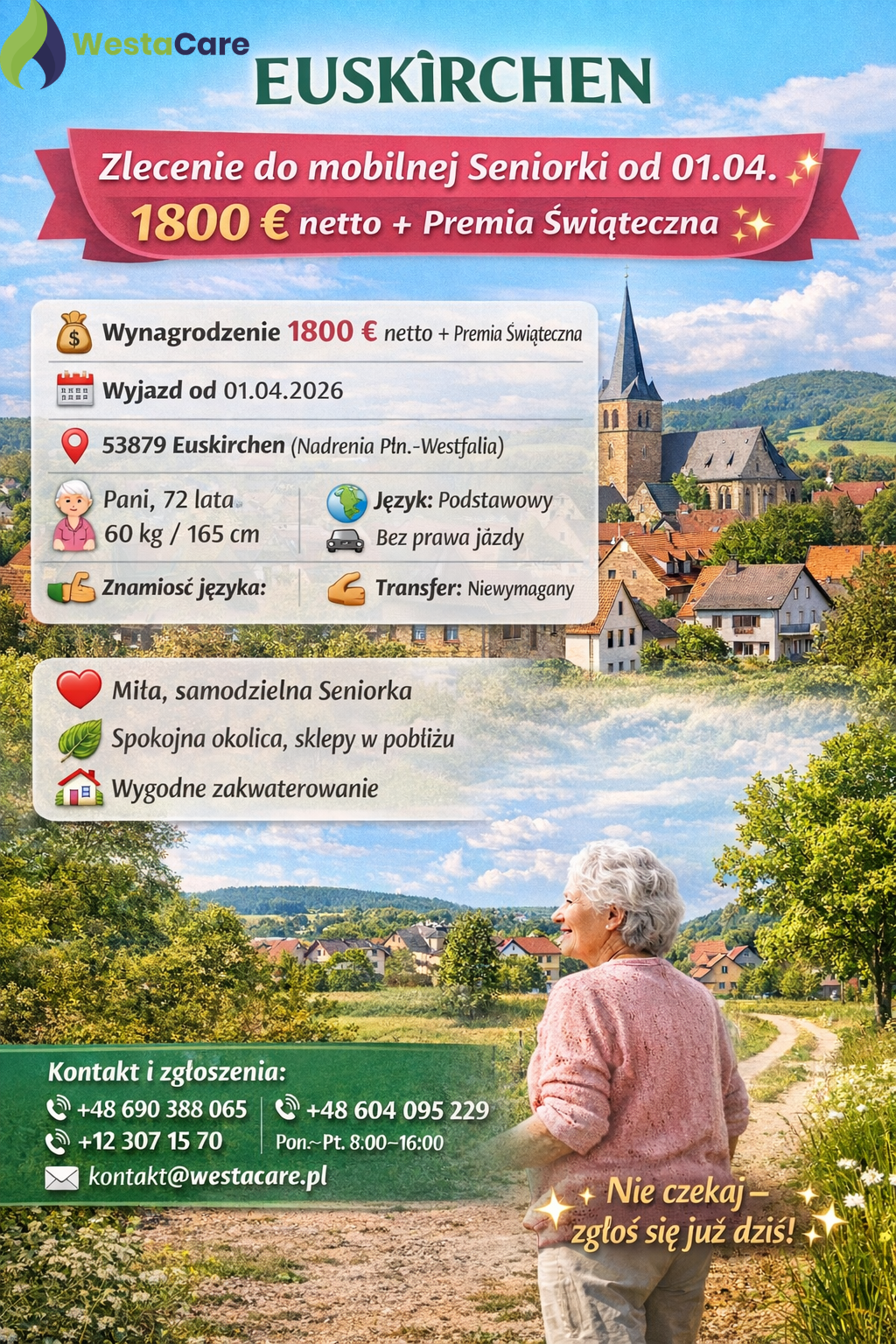 Zlecenie do mobilnej Seniorki od 01.04. 1800 € netto + Premia Świąteczna ✨